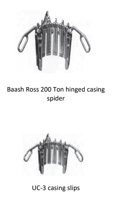 CASING SPIDERS The Baash Ross 200 ton hinged casing spider will fit most casing handling operations. It can be placed on the rotary table, mounted on a platform which replaces the rotary table, or supported by cribbing, depending upon the auxiliary equipment and procedure to be followed. |